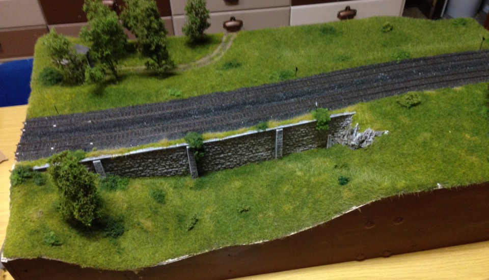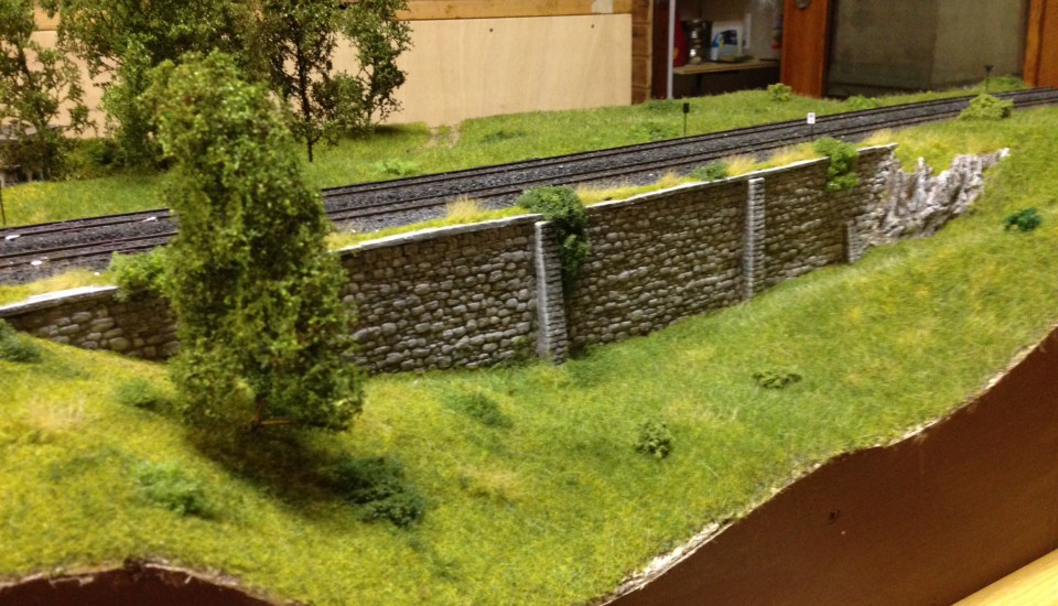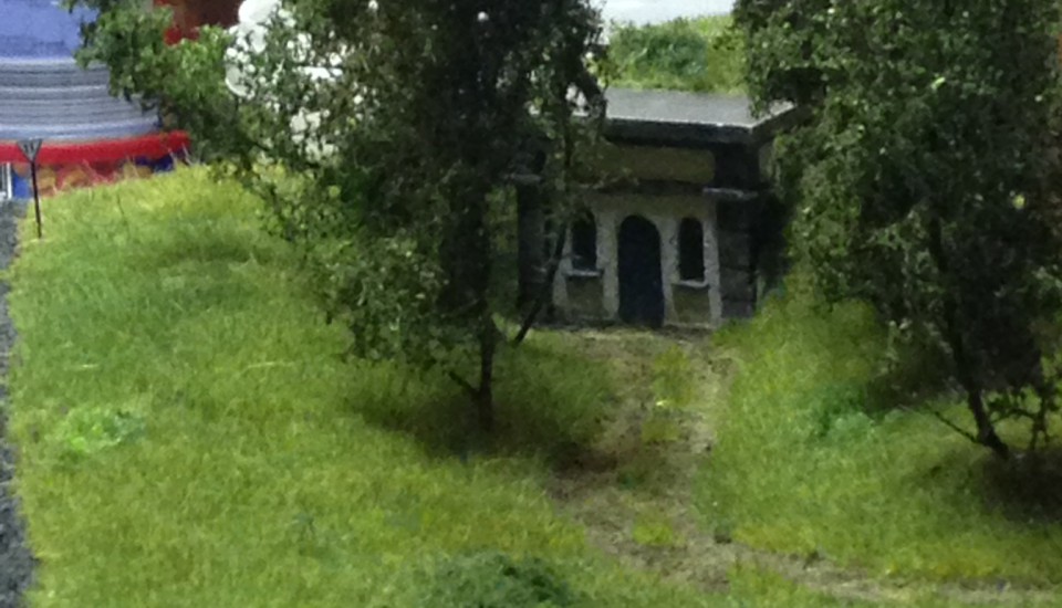 Das Modell des Hochbehälters entstand als Gipsabguss einer selbst erstellten Silikonform. Die Bruchsteinmauer basiert auf Spörle-Formen; farblich kamen Acryl- und Abtönfarben zum Einsatz. Die Bäume wurden in Handarbeit aus Seeschaum und Belaubungsmaterial gefertigt.