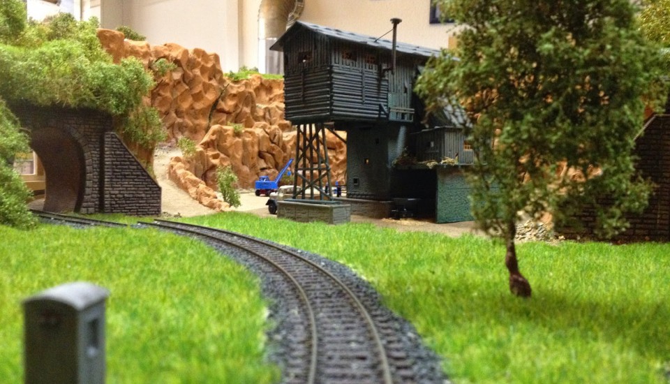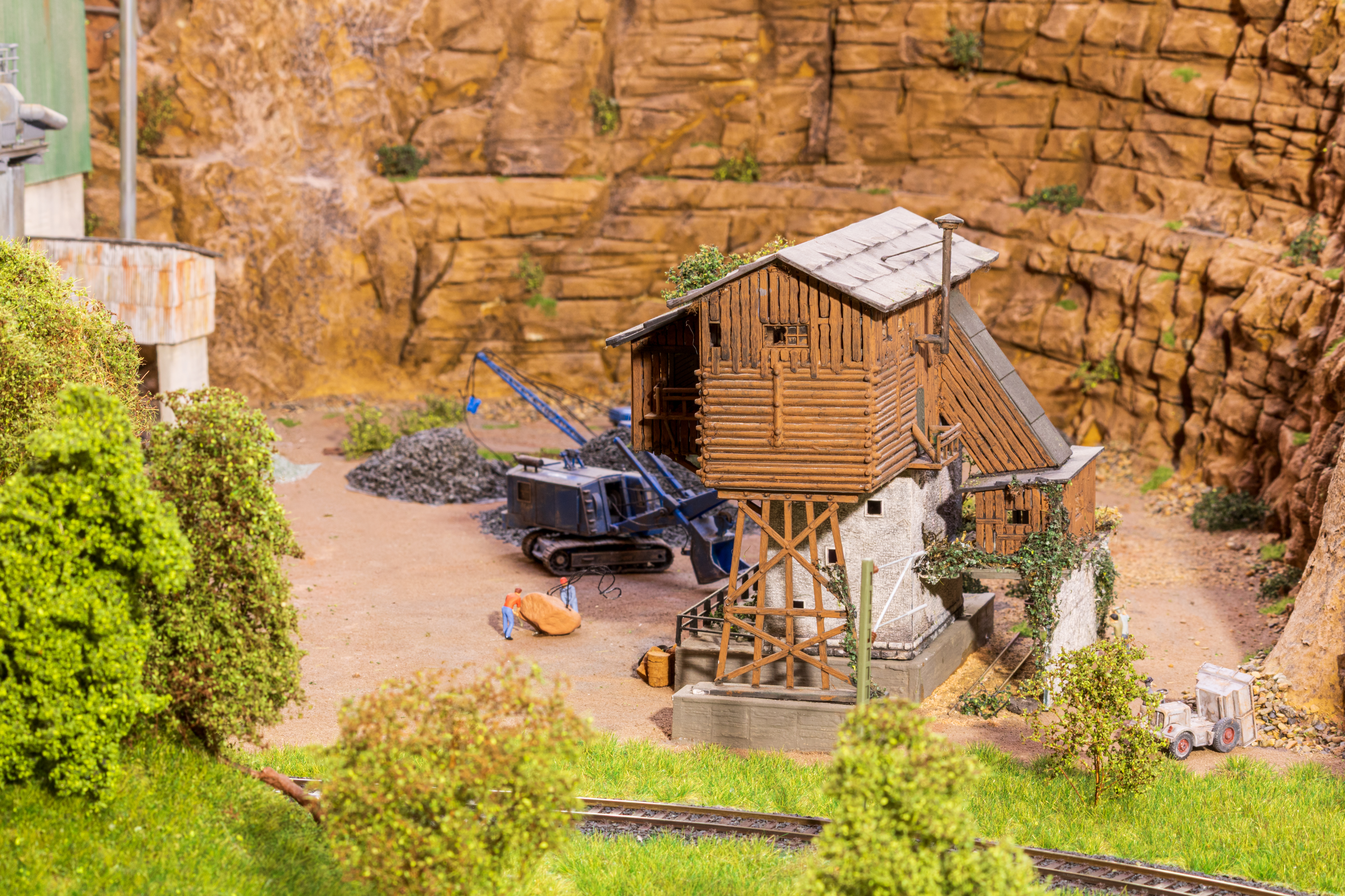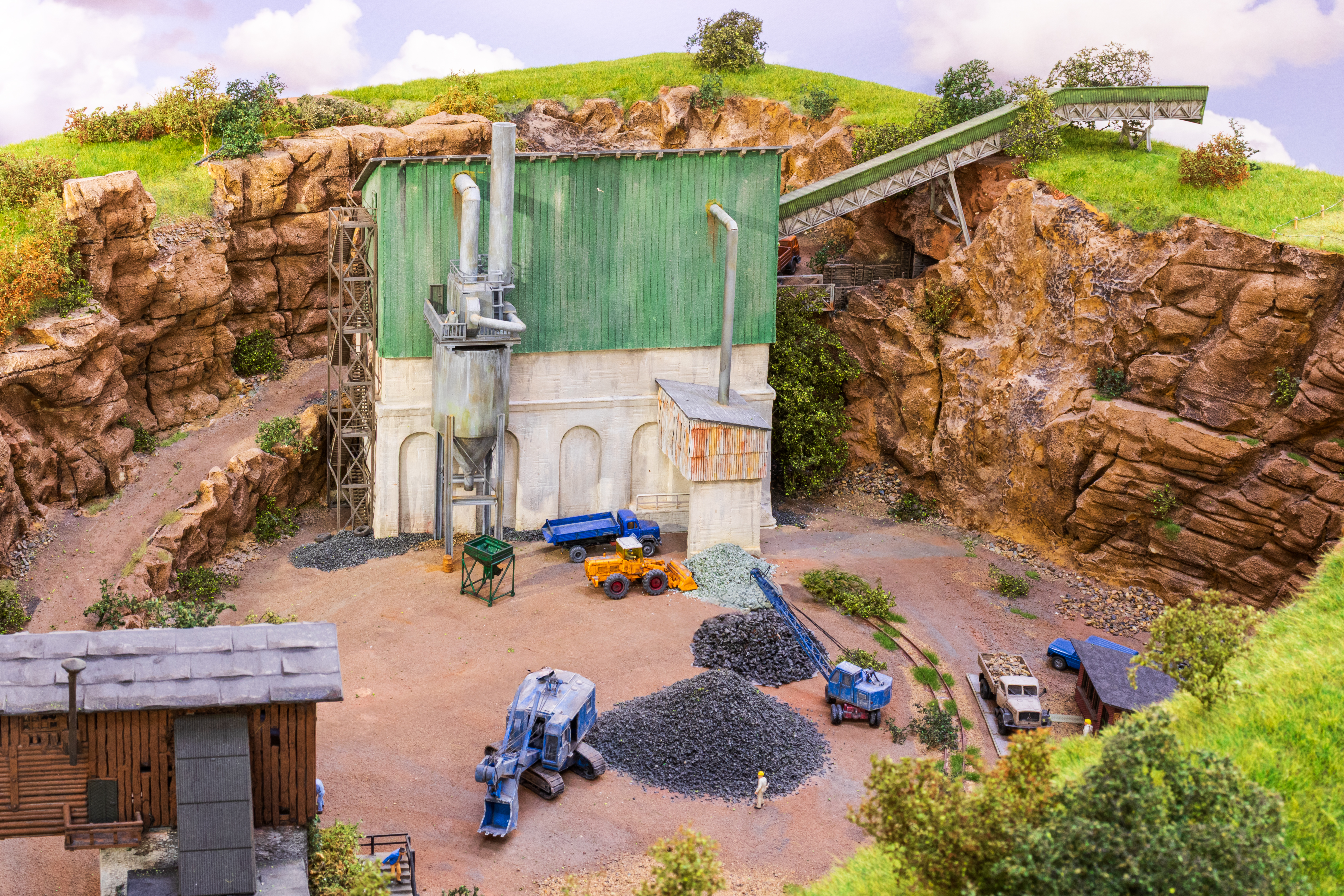 Besonderheit: Neben den aufwändig gestalteten Sandsteinfelsen verkehrt eine H0e-Feldbahn, die den Steinabbruch pendelnd abtransportiert.