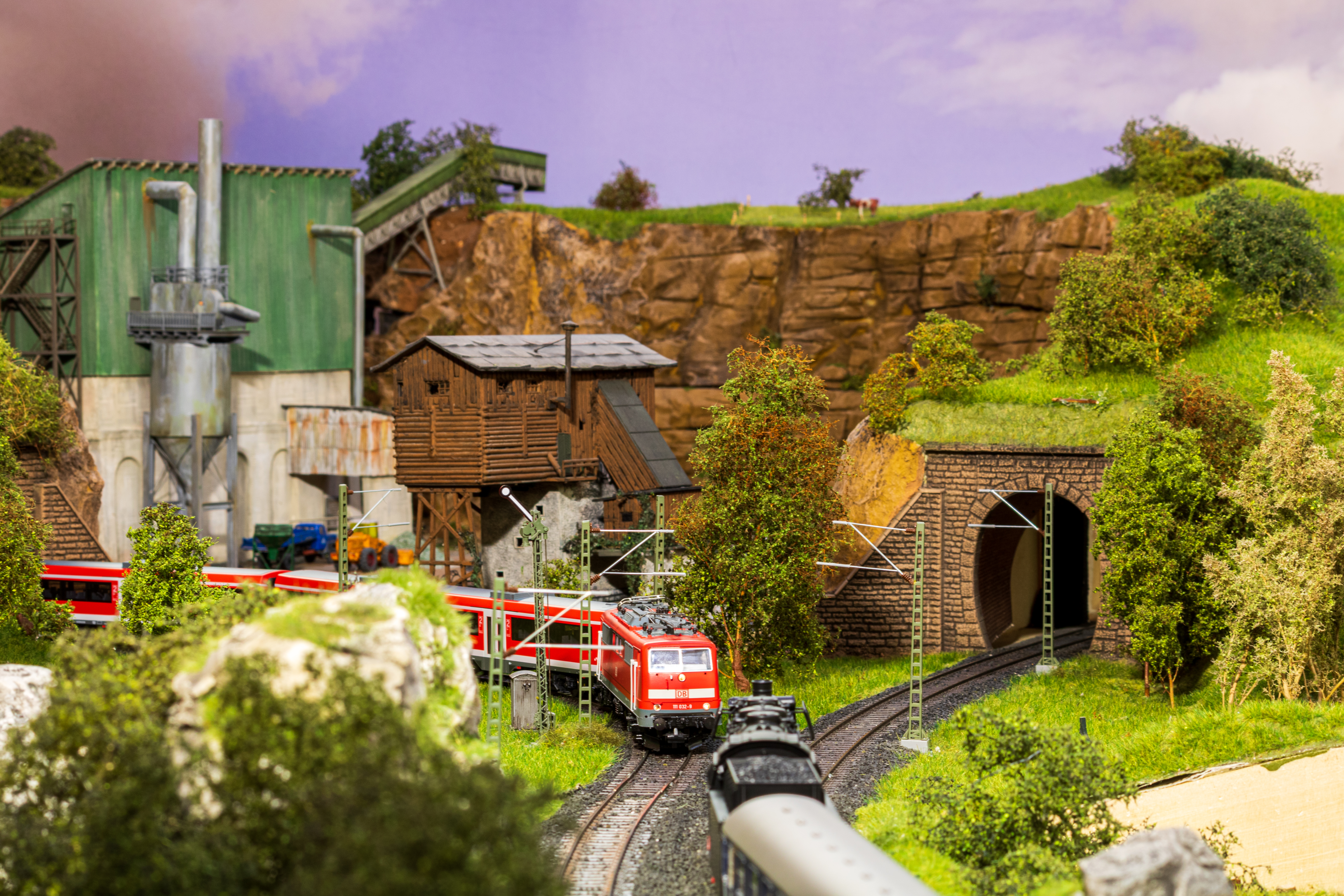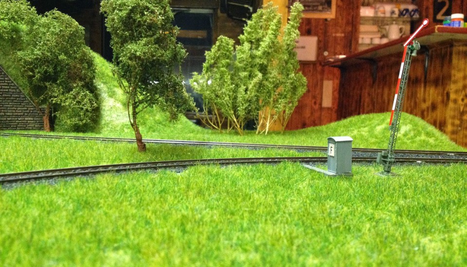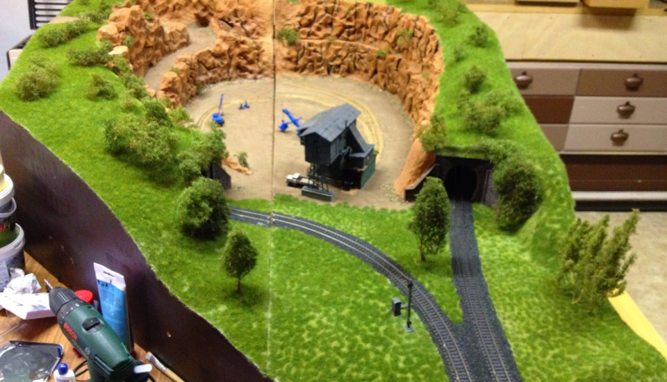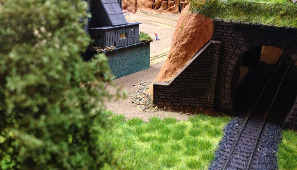 Besonderheit: Neben den aufwändig gestalteten Sandsteinfelsen verkehrt eine H0e-Feldbahn, die den Steinabbruch pendelnd abtransportiert.