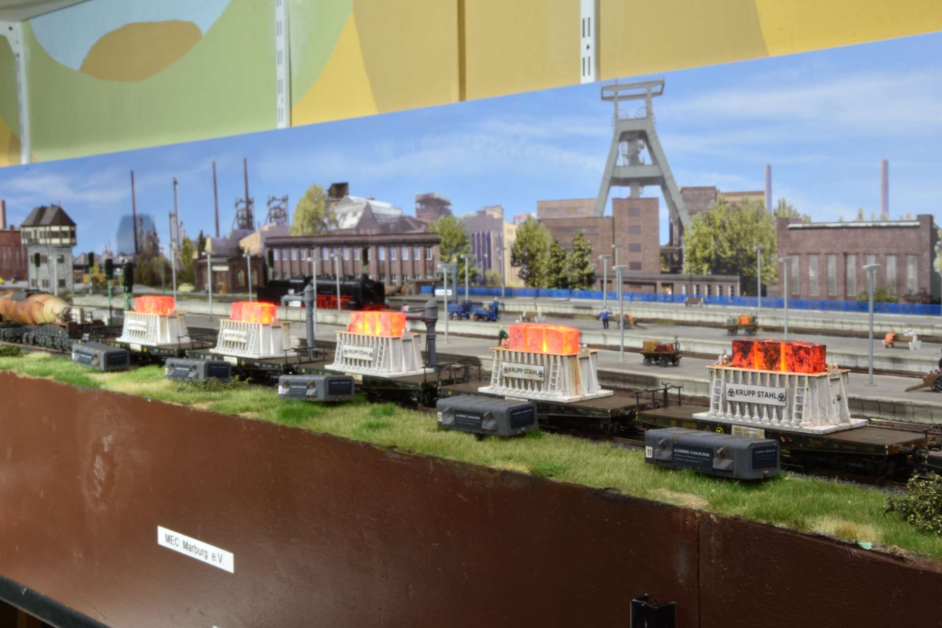 Ein Teil der Thermohauben hat beleuchtete/Glühende Brammen erhalten. Beim Abnehmen der Haubenabdeckung werden diese mit LED zum leuchten gebracht und erzeugen den Eindruck von glühenden Stahlbrammen.